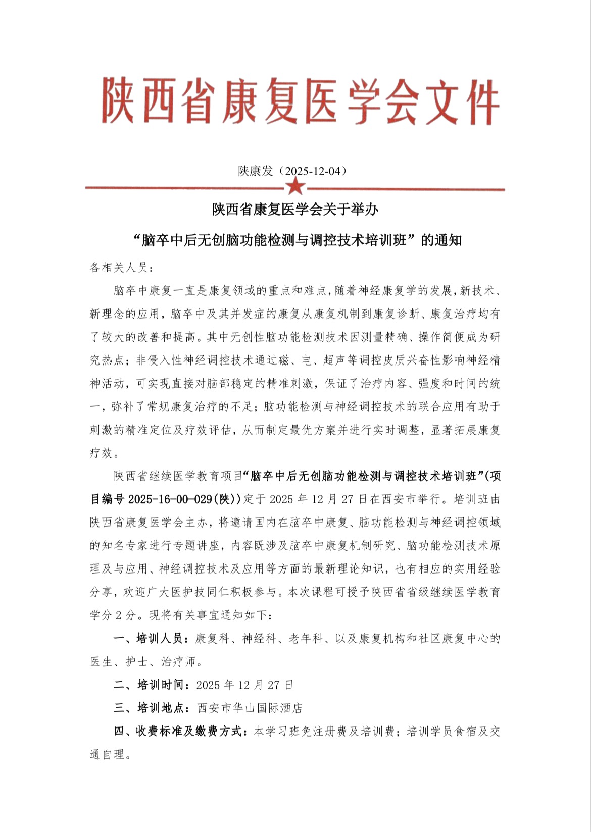 陕西省康复医学会关于举办“脑卒中后无创脑功能检测与调控技术培训班”的通知