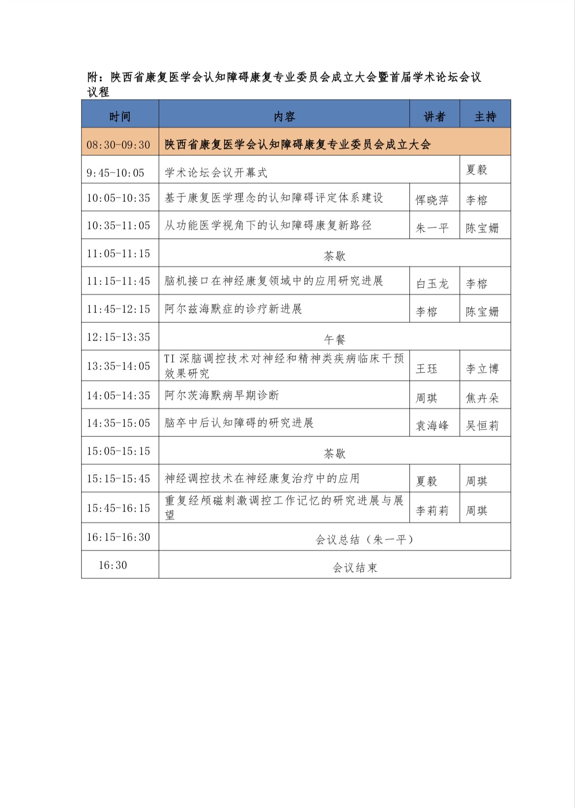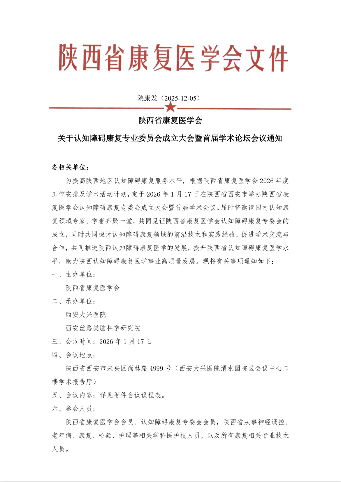 陕西省康复医学会关于认知障碍康复专业委员会成立大会暨首届学术论坛会议通知