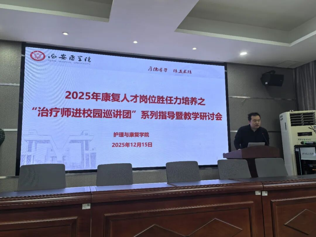 2025年12月15日下午2:30,由陕西省康复医学会物理治疗专业委员会、康复教育专业委员会主办,西安医学院护理与康复学院承办的“康复人才岗位胜任力培养之“治疗师进校园巡讲团”系列指导暨教学研讨会”,在该校护理与康复学院学术报告厅顺利召开。护理与康复学院崔老师担任学术主持人,康复专业师生代表到场参与。