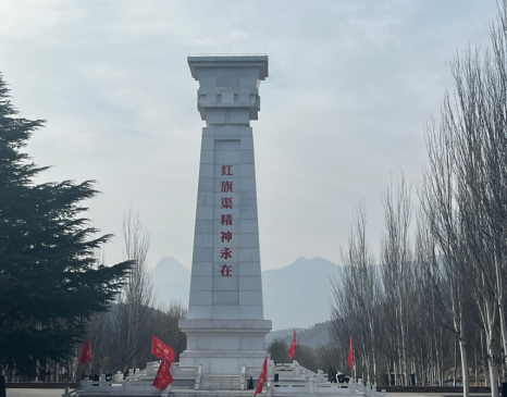红褐色的纪念馆依山而建,与太行崖壁融为一体,如同矗立山间的精神丰碑。步入红旗渠纪念馆,时光的闸门缓缓打开。在“千年旱魔,世代抗争”“红旗引领,创造奇迹”等展区,枯树伶仃的旱区村落复原景、青筋暴起的筑渠人群像雕塑、衣衫单薄的建设者黑白老照片,将“水贵如油”的苦难过往与“一锤一钎凿太行”的坚毅壮举交织呈现。当听到除险队长任羊成被石块砸掉三颗牙齿仍徒手作业的事迹时,不少同志热泪盈眶。大家在锈迹斑斑的钢钎、破旧的扁担等实物前久久驻足,指尖轻抚展品,真切触摸到那段“敢教日月换新天”的滚烫岁月。