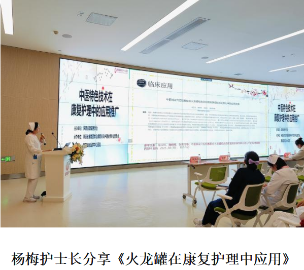西安国际医学中心医院神经康复八科护士长杨梅在《火龙罐在康复护理中应用》报告中,介绍了这一集艾灸、刮痧、推拿于一体的复合技术,通过真实案例展现其在改善局部循环、缓解痉挛疼痛、提升患者康复信心方面的综合优势,拓宽了康复护理的干预手段。